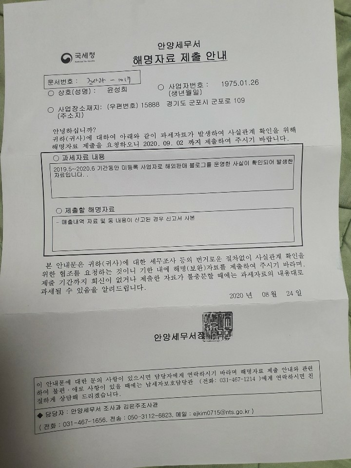 안녕하세요 해외블로그판매자인데 이번에 안양세무서에서 조사가나와서..